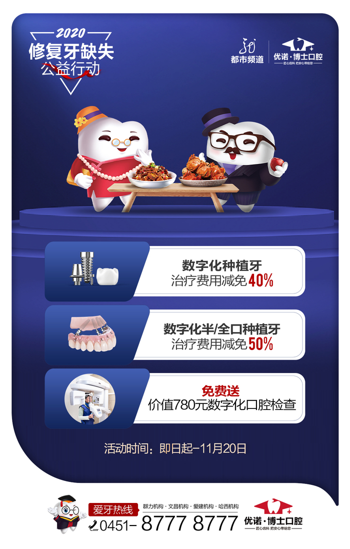 为让更多牙缺失人士重获健康,拥有好口福,黑龙江广播电视台都市频道联合优诺·博士口腔启动“修复牙缺失公益行动”,单颗、多颗牙缺失者做数字化种植牙可减免治疗费用40%,半口、全口数字化种植牙可减免治疗费用50%,还可赠送价值780元的数字化口腔检查,享种植大咖联合会诊,牙缺失的市民可拨打优诺·博士口腔爱牙热线0451-8777 8777咨询了解。