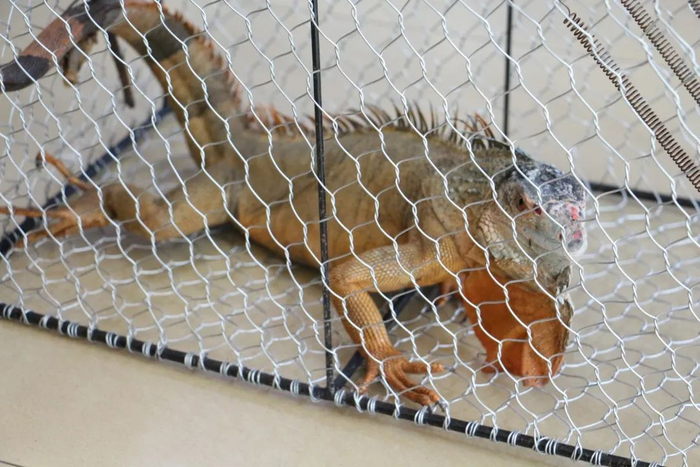 为免蜥蜴伤及他人,对当地生态环境造成威胁,民警提起铁笼就爬上了房顶。他悄悄接近蜥蜴,然后迅速用铁笼将其套牢,成功捕获这只误闯民居的蜥蜴。