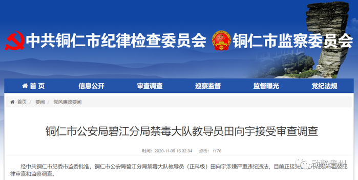 经中共铜仁市纪委市监委批准,铜仁市公安局碧江分局禁毒大队教导员(正科级)田向宇涉嫌严重违纪违法,目前正接受铜仁市纪委市监委纪律审查和监察调查。