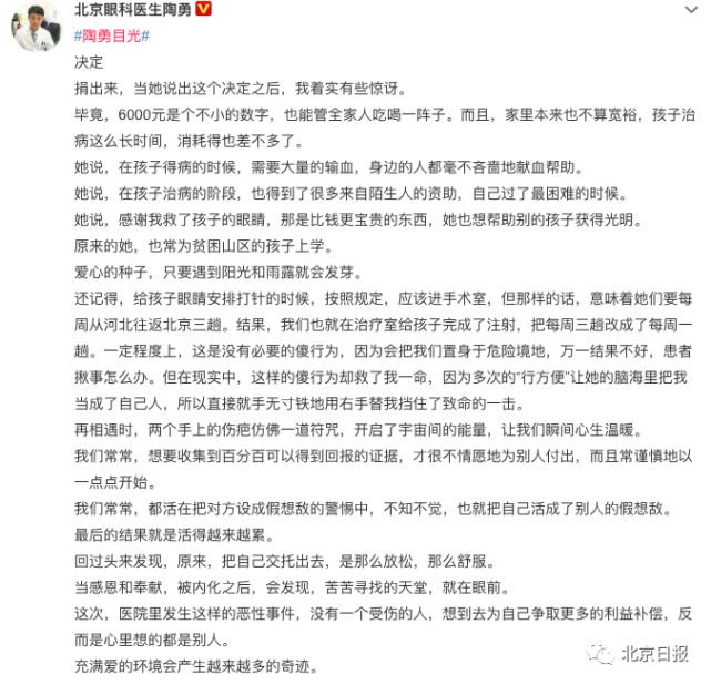 11月7日,北京朝阳医院眼科医生陶勇,在社交媒体上分享了一个温暖的故事。