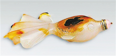 最早的鼻烟壶是舶来品,明末清初欧洲鼻烟传入中国,随着鼻烟的广泛普及,推进了鼻烟壶的国产化进程。清代宫廷多方请来巧匠,专门为皇帝制造各式鼻烟壶。清初,鼻烟壶被上流社会视为珍玩,用以寄寓个人品位,加之鼻烟有一定的药用性,可借以醒脑提神,即使没有吸食鼻烟习惯的人,只要经济允许,也会在家里备一瓶鼻烟,作为不时之需。当时,鼻烟由此成为一种时髦消费品,用来盛放鼻烟以便于随身携带的小瓶子,也成了身份的象征。如今,鼻烟早已淡出人们的生活,但鼻烟壶却作为一种精美艺术品流传下来,而且长盛不衰。笔者收藏的这件玉鱼鼻烟壶恰是将两种精美的工艺融为一体,更有一番逸趣。