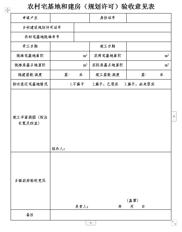 (三)农户建房完工后,实地检查农户是否按照批准面积、四至等要求使用宅基地,是否按照批准面积、规划要求、乡村建设规划许可证所确定的图集或房屋设计方案建设住房,并出具《农村宅基地和建房(规划许可)验收意见表》(详见附件7)。