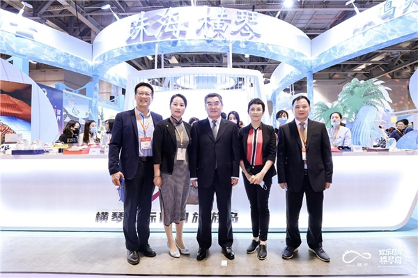 广东省文旅厅厅长汪一洋(左三)、副厅长张奕民(右一),珠海市文化广电旅游体育局局长王玲萍(右二)、副局长邬向明(左一),与横琴新区管委会社会事务局局长朱自琴(左二)共同视察横琴展位