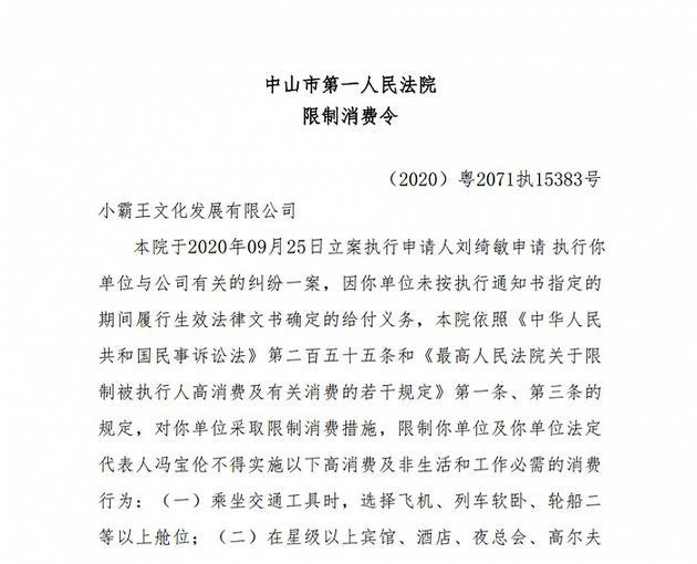 天眼查APP数据显示,小霸王法人冯宝伦近日被法院列为限制高消费人员。该限制消费令显示,冯宝伦不得在星级以上宾馆、酒店、夜总会、高尔夫球场等场所进行高消费,不得购买不动产或者新建、扩建、高档装修房屋等。