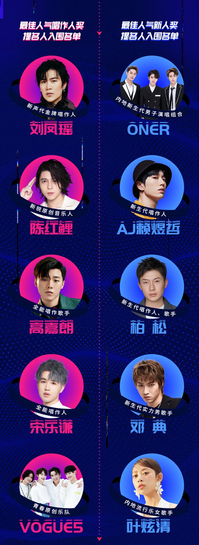 延续“真我”主题,本届“来电之夜”基于两大乐榜客观数据,并参考唱片公司及乐评人诚意推荐,最终诞生了2020年度十组优秀提名音乐人:新声代金牌唱作人刘凤瑶,此前已荣获各音乐先锋榜最佳新人、流行金曲排行榜新生力量制作人等奖项;95后新锐原创音乐人陈红鲤,在个人原创专辑《多云转晴》中担任全专词曲人,同时潜心创作更多优质原创词曲;内地新生代男子演唱组合代表ONER刷新乐迷视野、新生代唱作人AJ赖煜哲不断拓展风格边界……他们不仅是全民真乐粉丝的认可与选择,也是华语乐坛原创力量、新声态度的代表。