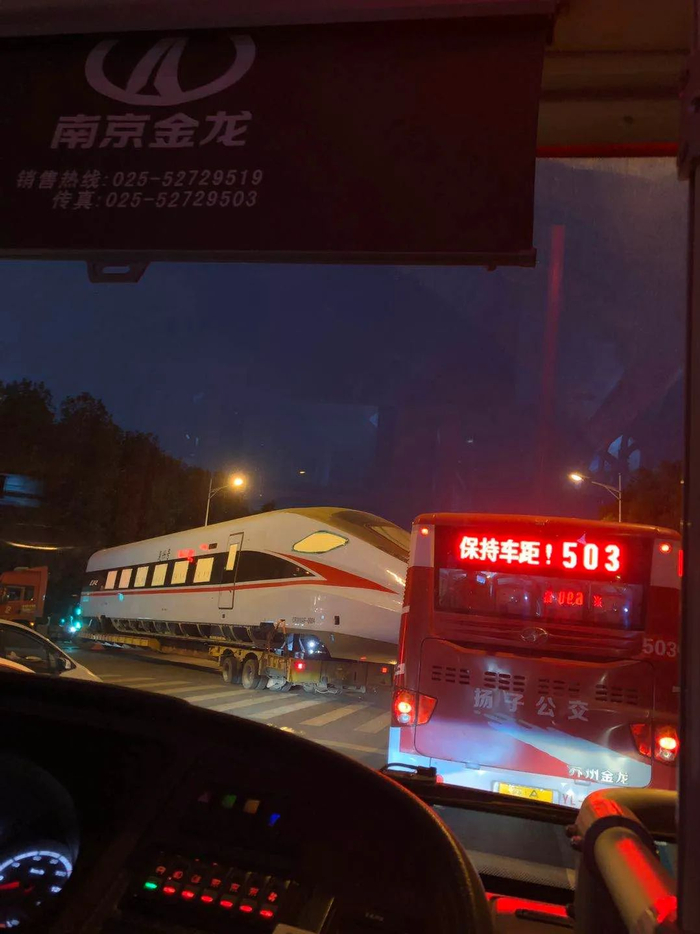 11月7日下午5点半左右,南京503路公交车正在由南向北行驶至浦厂小区路段,公交车在最右侧车道等红灯时,一辆装载着复兴号车头的半挂车在转弯时,不慎擦到了公交车,造成公交第二块玻璃损坏。由于半挂车车身较长,现场造成了短暂的交通拥堵,但没有人员受伤。