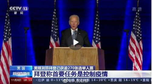 美东时间7日晚8时(北京时间8日9时)许,拜登和哈里斯在特拉华州威尔明顿向全美发表讲话。拜登在讲话中呼吁不同种族的美国人更加团结,称将弥合社会分歧,带来社会公平,对所有人更加包容。拜登强调,上任后的首要任务是控制新冠疫情。(人民日报)