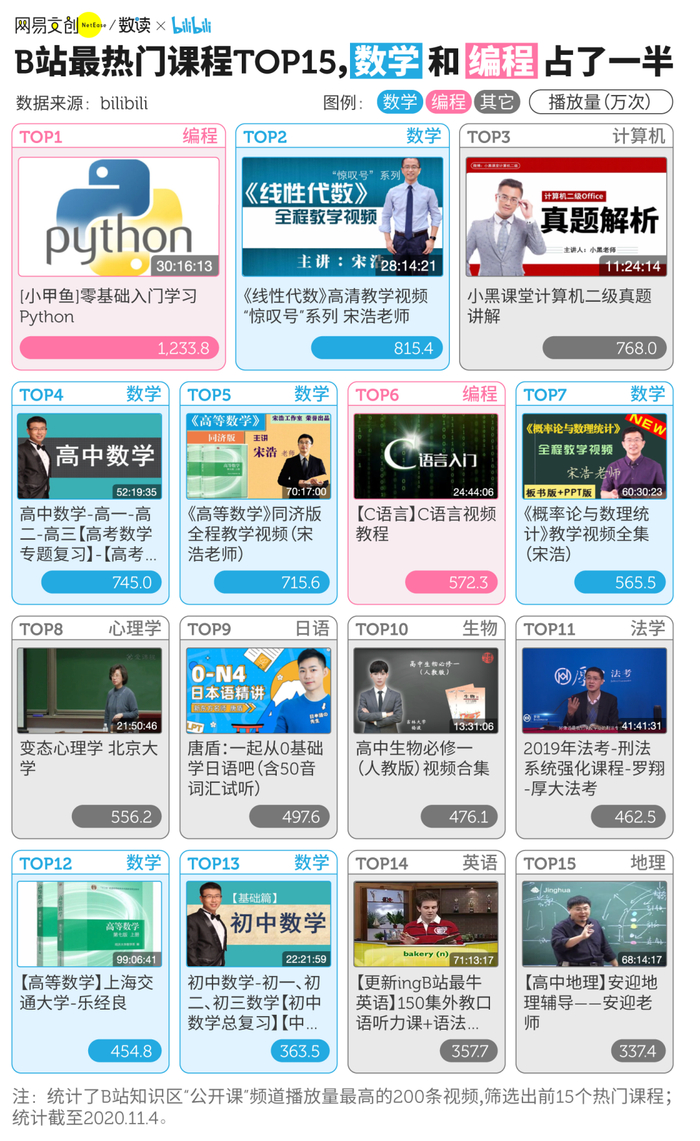 B 站最热门的 15 个课程里,数学和编程课占了一半。从《初中数学》《高中数学》,到《高等数学》《线性代数》《概率论与数理统计》,数学简直是伴随着中国学生成长的“噩梦”。在学校里学不好数学,就来 B 站偷偷补课。