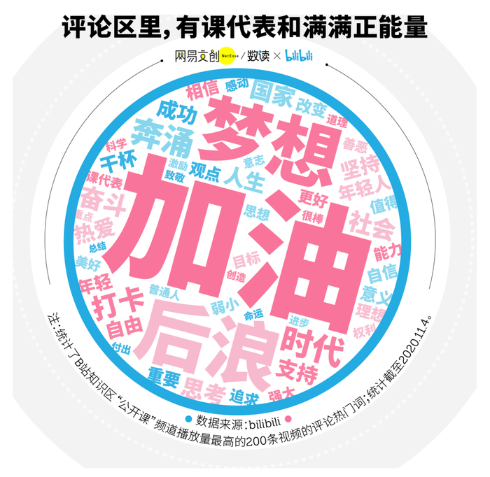 和弹幕即时的短互动不同,评论区能发表的字数更多,话语里也包含了更多真情实感。例如“加油”“时代”“梦想”“后浪”“奋斗”这些正能量词语,体现了 B 站年轻人的理想与热血。