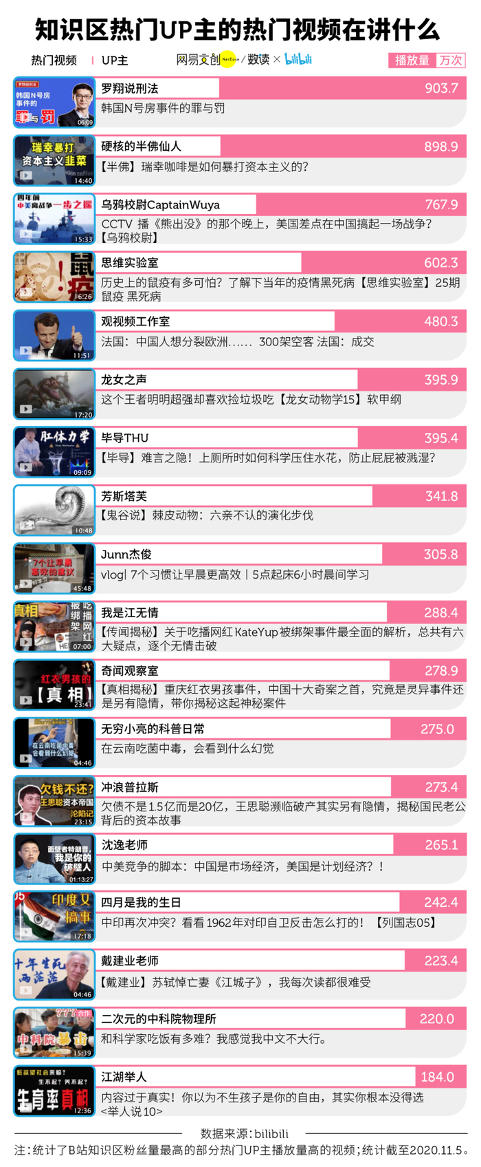 粉丝数最高的这些 UP 主,精通的领域从法律、社会、泛财经、科学,到文学、历史、学习分享,囊括了年轻人主流和非主流的知识需求。