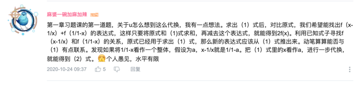 不光争做课代表,甚至有不少用户会主动在评论区回答老师在视频里的提问,交上自己的作业。在中国地质大学的高等数学公开课下面,就有用户对习题课的问题提出了自己的一些思考。