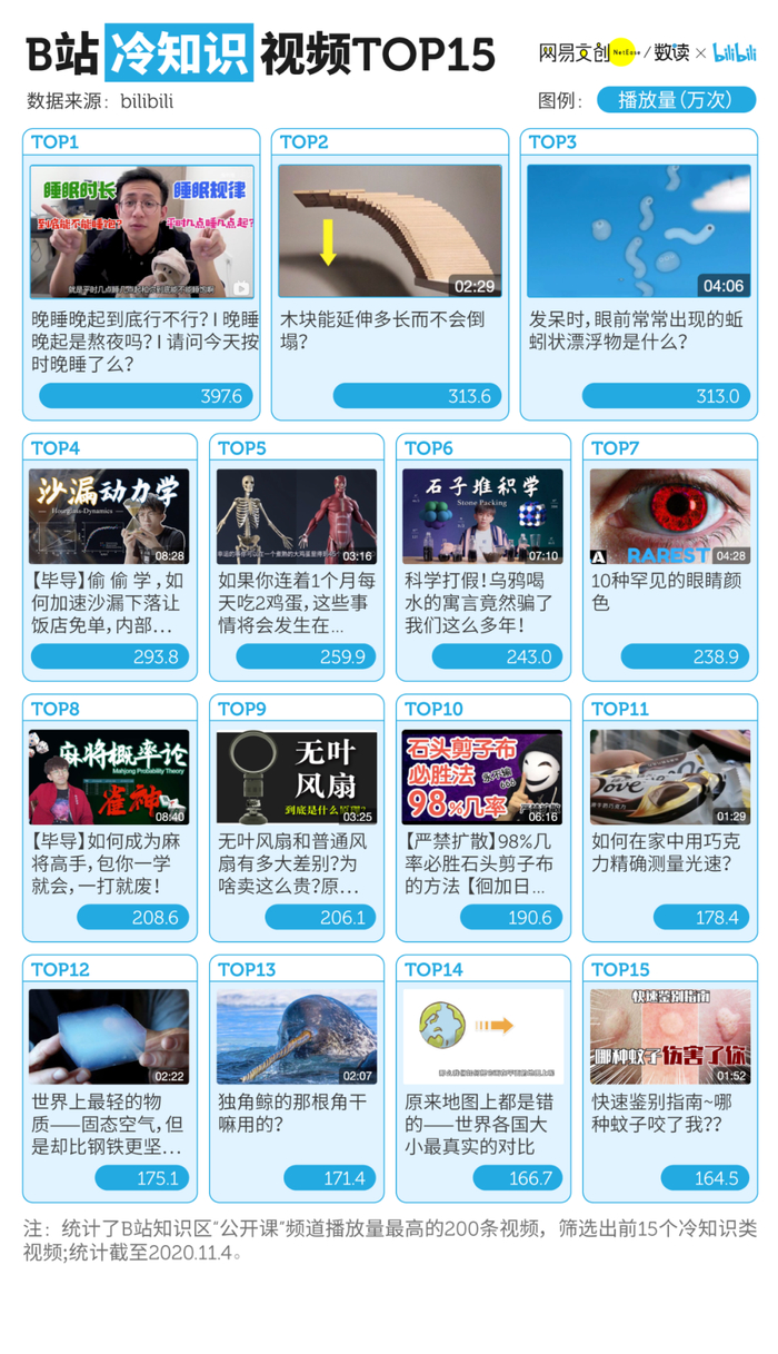 “晚睡晚起到底行不行?晚睡晚起是熬夜吗?”“木块能延伸多长不会倒塌?”“发呆时,眼前常常出现的蚯蚓状漂浮物是什么”,这是 B 站最火的 3 个冷知识视频,播放量均超过了 300 万。