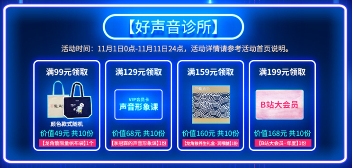 除惊喜价格回馈外,京东龙角散海外自营旗舰店还推出了以“好声音诊所”为主题的买赠回馈活动,为店内购物的消费者送上了定制购物袋、好声音礼盒、大咖声音专项课程以及B站大会员等多重好礼,具体领取方式详见店内公告。