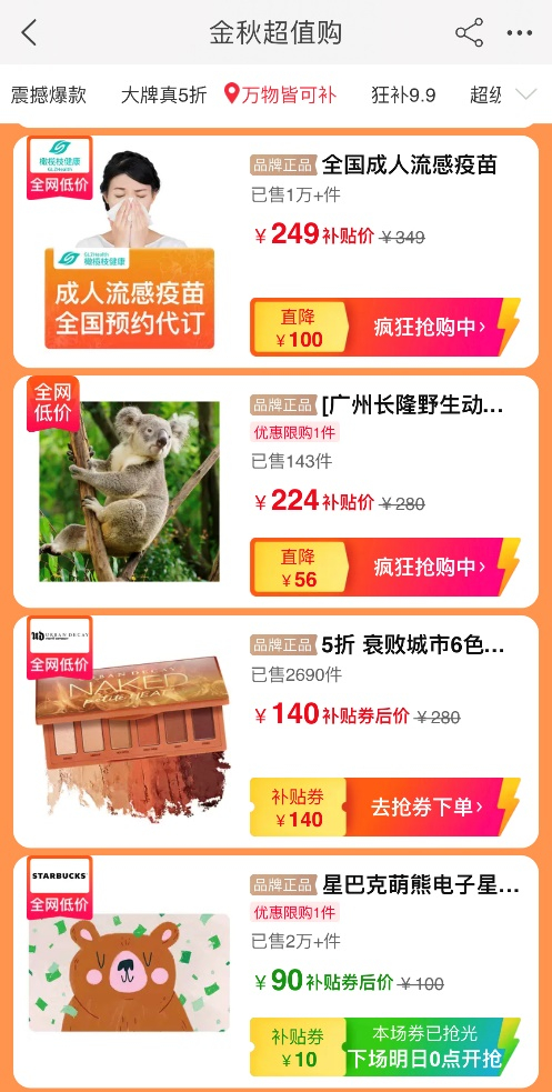 就比如在10月国庆假期,聚划算百亿补贴与飞猪联动推出半价机票酒店,助力全国消费者出行旅游;9月上线的【10亿餐桌计划】帮助众多优质农产品快速销货,让农民商户好好过了一次丰收节; 8月在入秋流感高发季时,联合阿里健康上线流感疫苗补贴,守护大众健康避免流感与新冠交叉感染。