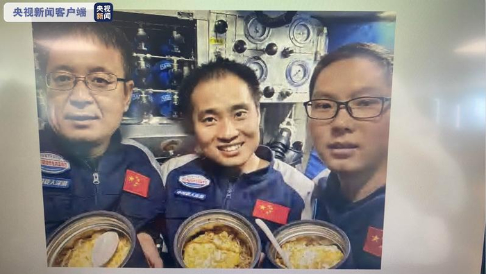 ▵三位潜航员在潜水器内拍摄的午餐合影