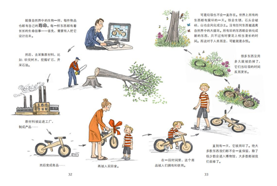 一件可用物品的诞生意味着很多垃圾被一同制造了出来。以下面这张图为例,一辆木质平衡车需要用到一棵树,而制造木车的同时产生的废弃木料就是垃圾,制作车子的工厂排放物是垃圾,而当车子被弃用,它自己也成为了垃圾。