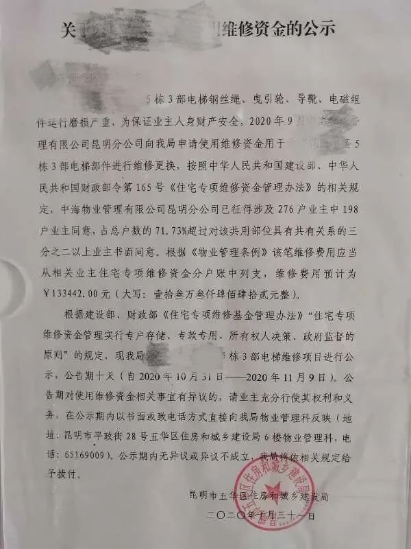 公示中写道:“小区5栋3部电梯钢丝绳、曳引轮、导靴、电磁组件运行磨损严重,为保证业主人身财产安全,物业申请使用维修基金13万多元对3部电梯部件进行维修更换,71.73%的业主都已同意。”
