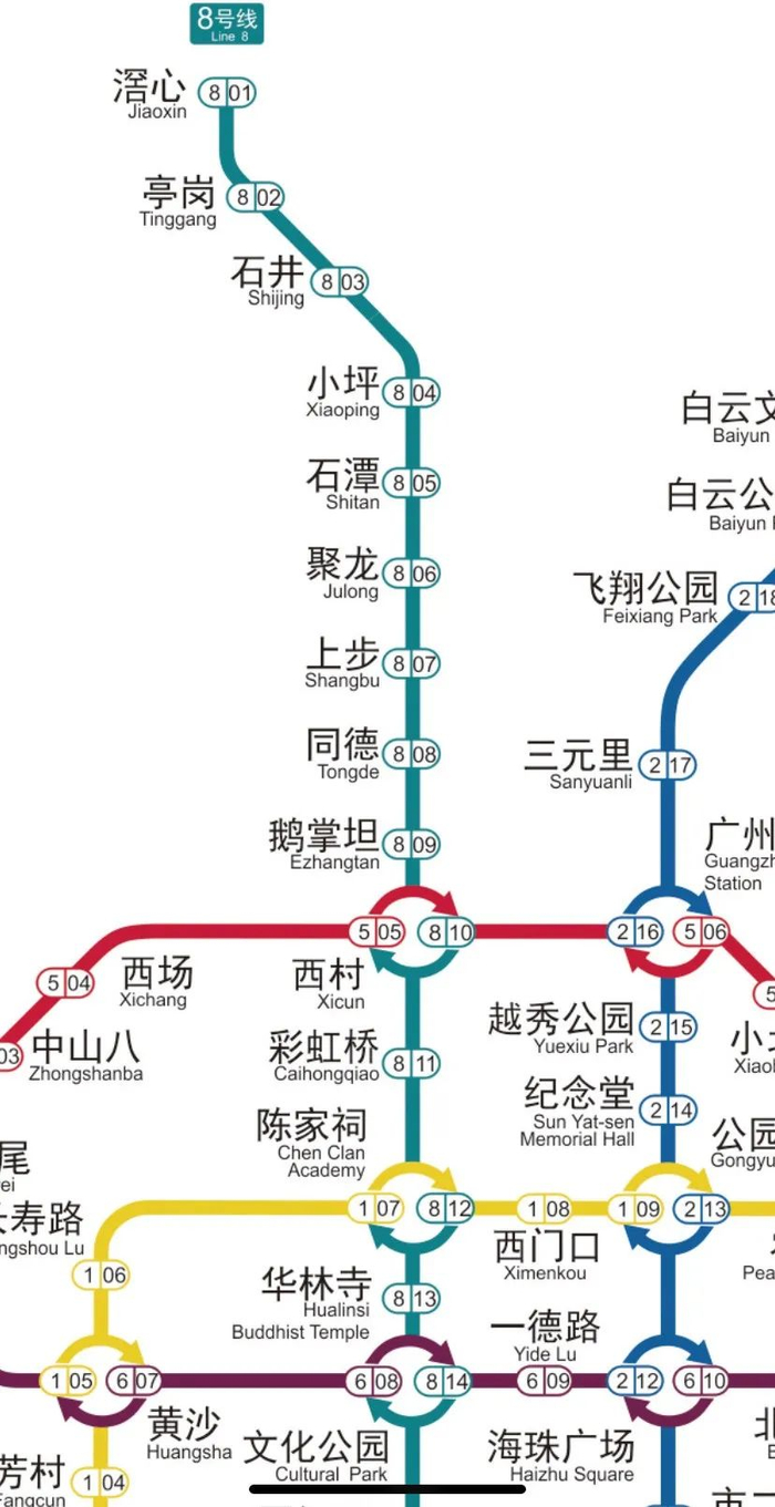 八号线北延段(文化公园至滘心)全长16.1公里,线路从已开通的文化公园站出发,途经华林寺站、陈家祠站、彩虹桥站、西村站、鹅掌坦站、同德站、上步站、聚龙站、石潭站、小坪站、石井站、亭岗站,最终到达滘心站。