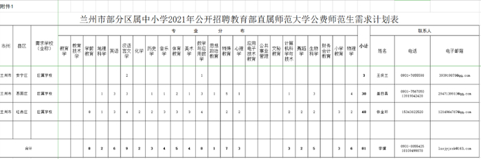 具体招聘计划和岗位要求详见《兰州市部分区属中小学2021年公开招聘教育部直属师范大学公费师范生需求计划表》(附件1)。