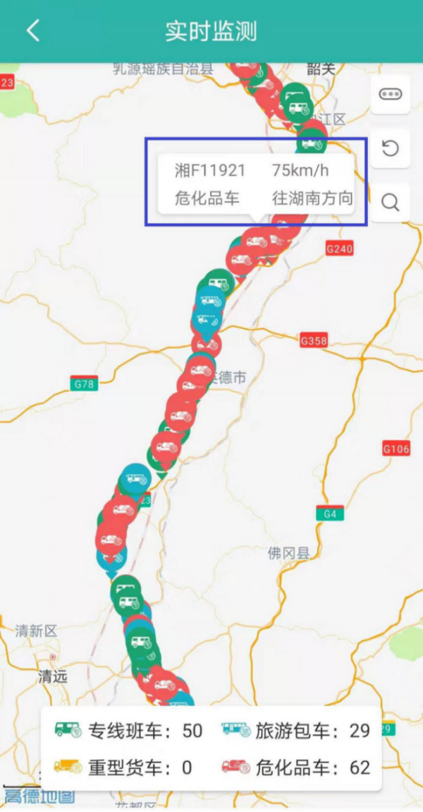 神器功能:对告警数据进行超速、疲劳驾驶以及告警危险系数分类,实时监测在乐广高速上行驶的“两客一危”车辆的相关信息。