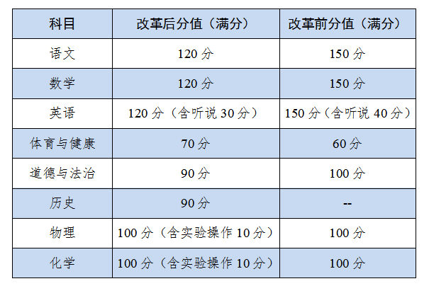 答:录取计分科目满分为810分,与现行中考的总分值保持不变,各科具体分值变化见下表: