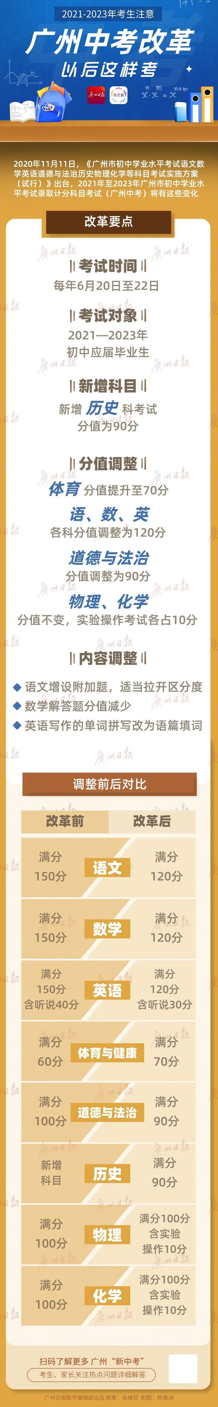 2021年开始,广州实施高中阶段学校考试招生制度改革。11月11日,广州市教育局发布了《广州市初中学业水平考试语文数学英语道德与法治历史物理化学等科目考试实施方案(试行)》,以及关于该方案的问答,详细解答了广泛关注的问题。