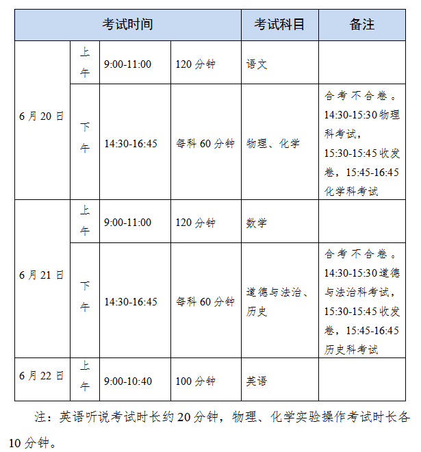 语文、数学、道德与法治和历史4个科目实行闭卷笔试;英语实行闭卷笔试和听说能力考试;物理和化学2个科目实行闭卷笔试和实验操作考试。