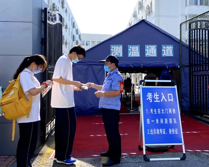 北京一处高考考点,考生在准备进入测温通道 魏梦佳 摄