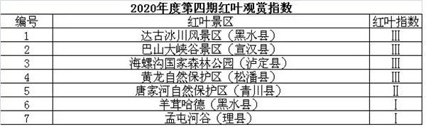 据省林草局官网,2020年度第四期红叶指数发布啦!本周已进入冬季,伴随着进一步降温降雪,省内部分海拔较高的景区受冷空气和降雪影响已进入红叶观赏尾期。目前黑水达古冰川风景区、宣汉巴山大峡谷景区、海螺沟国家森林公园、黄龙自然保护区红叶正好,请游客们抓住本周仅剩的时间,留住最后一抹红。(四川发布)