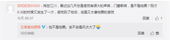 在江川的网友表示:早上9点半的时候感觉地动,但又不太像地震……下面云南省地震局回复:怕不是地震,会不会是风太大了。