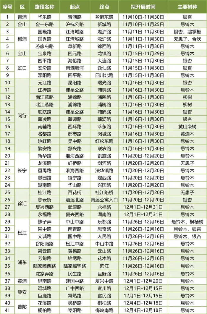 海岸君从官方列表上发现,今年上海41条落叶不扫的马路,相比于去年有部分更换及新增。上海市市容环境质量监测中心道路保洁科负责人表示,调整替换是为了获得更好的落叶景观效果。比如,有些落叶景观道路周边施工,道路不具备“落叶不扫”的条件,就会将其换下。又如,关于落叶树种的选择,也征求过绿化管理部门的意见。落叶景观道并非越多越好、越长越好,而是要控制数量、精益求精。
