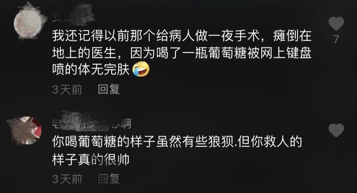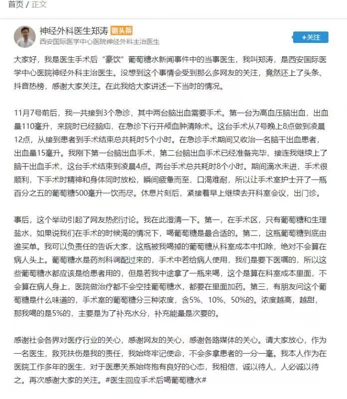 对于“豪饮葡萄糖”在网络走红又被质疑一事,郑涛坦然一笑说:“很多外科医生都有类似的经历吧!我可以理解大家的担忧,也感谢多数网友的支持和理解。”