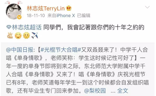 早在2018年的时候,原唱林志炫就曾发微博称,会记得跟同学们的十年之约。