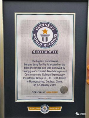2019年3月,在吉尼斯世界纪录认证官皮特的认证下,贵州黄果树坝陵河大桥蹦极,吉尼斯世界纪录认证成功,成为了世界最高的商业蹦极设施。据悉,该蹦极平台距离桥底的垂直高度达370米,超过了“世界最高商业蹦极跳设施”吉尼斯纪录——233米的澳门旅游塔。