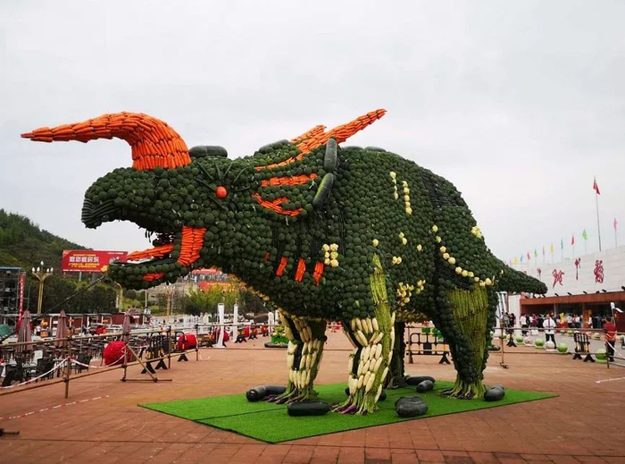 在赤水河谷国家级旅游度假区首届丰收嘉年华上,混合蔬菜雕塑“三角龙”获世界纪录认证,成为世界最大的混合蔬菜雕塑。它长14.32米,宽3.27米,高5.41米,用了10种蔬菜共8000多斤制作而成。
