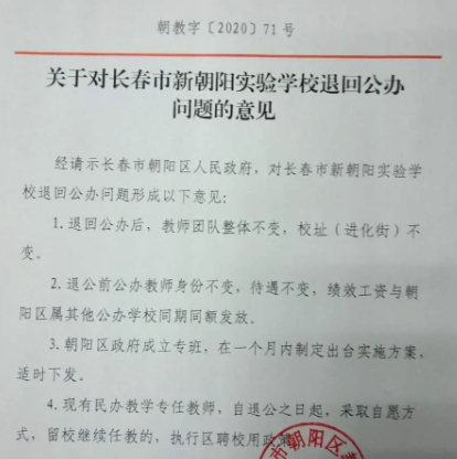 长春市新朝阳实验学校确定退回公办的事确定之后,热度仍然不减,很多家长对于学校退公之后如何招生也非常关注。