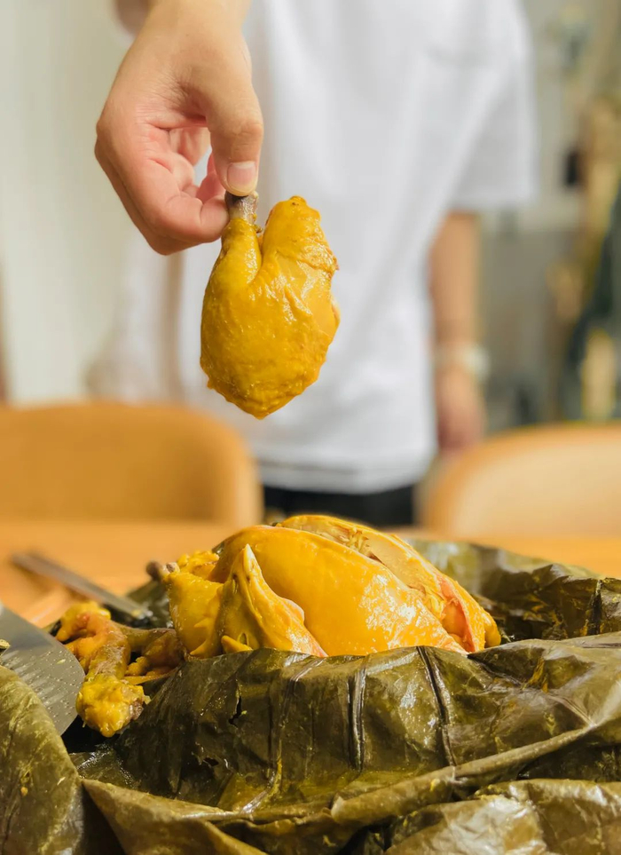 轻轻剥去荷叶,鲜嫩欲滴的荷叶鸡就呈现我们面前,香味真的是扑鼻而来...