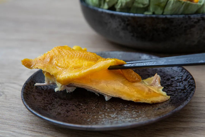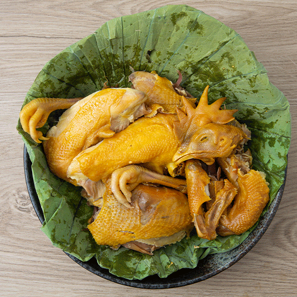 比如这只荷叶鸡,用清香的荷叶包裹鲜活的草鸡,荷叶香气融入鸡的每一丝纹理之中,皮滑肉嫩;轻轻一扯,骨肉分离。