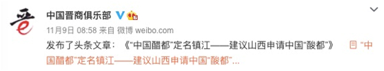 微博认证账号“中国晋商俱乐部”甚至发文“建议”,在“中国醋都”被抢走之后,山西可以申请中国“酸都”。