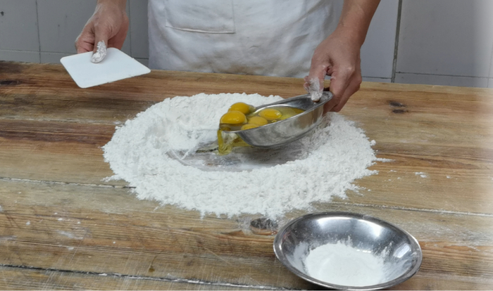 要完成色香味俱全的蛋散,首先需要进行配料,将面粉与鸡蛋拌匀,和成稍微干些的面团。