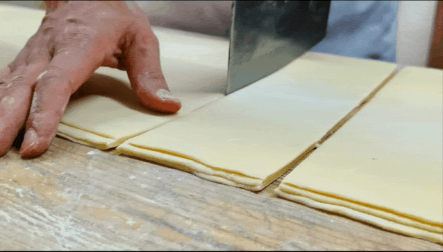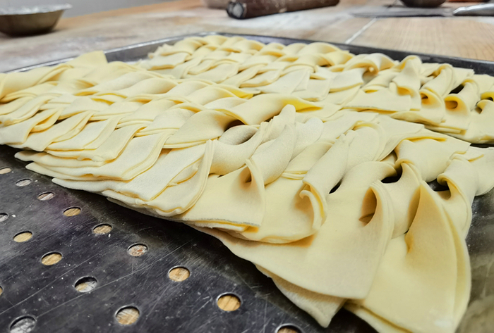 揉成光滑的面团,再慢慢将面团擀平,擀好的面横切成长条状,再纵切成一个个小方形面片,中间划一道小口,面片一端穿过小口再稍微拉长后就形成螺旋形。