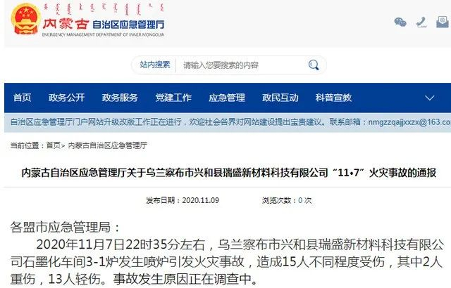 11月7日22时35分左右,乌兰察布市兴和县瑞盛新材料科技有限公司石墨化车间3-1炉发生喷炉引发火灾事故,造成15人不同程度受伤,其中2人重伤,13人轻伤。