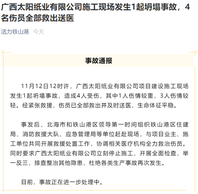11月12日12时许,广西太阳纸业有限公司项目建设施工现场发生1起坍塌事故,造成4人受伤。