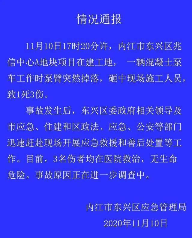 11月10日17时20分许,四川内江市东兴区兆信中心A地块项目在建工地,一辆混凝土泵车工作时泵臂突然掉落,砸中现场施工人员,致1死3伤。