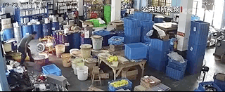 最初那个男员工又做出了最错误的选择:提着一桶水向着火泼了过去!
