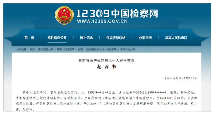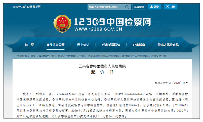11月13日,12309中国检察网公开了香格里拉市人民检察院对香格里拉市土地收购储备中心原主任刘志兴的起诉书。