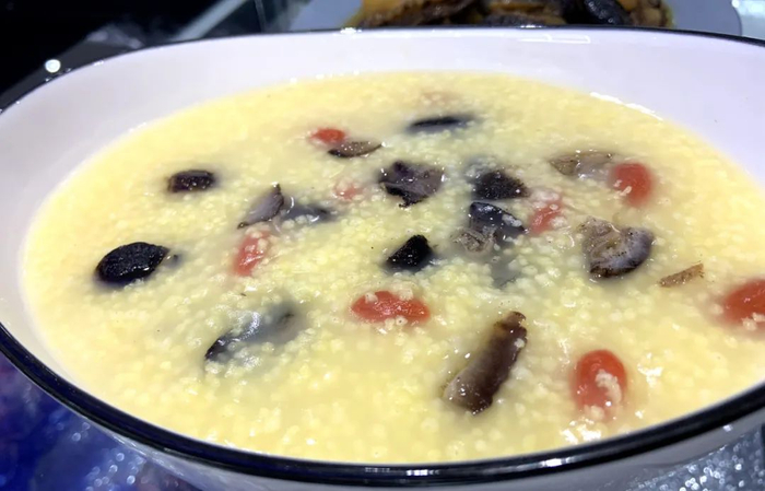 用小米、燕麦等杂粮炖煮海参,营养健康,富含膳食纤维,熬煮得浓稠香粘。海参入口柔嫩,滋味鲜醇,舒适爽口。