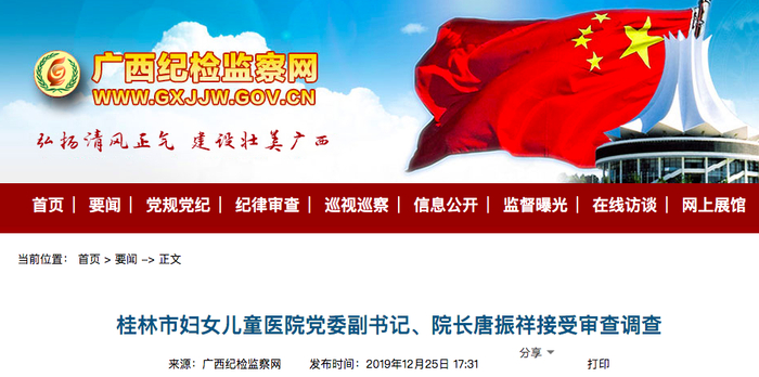 2019年12月25日,桂林市纪委监委消息:桂林市妇女儿童医院党委副书记、院长唐振祥涉嫌严重违纪违法,目前正接受纪律审查和监察调查。