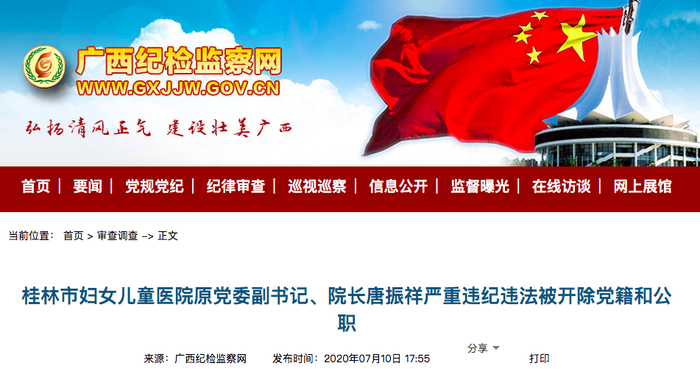 2020年7月 桂林市妇女儿童医院原党委副书记、院长唐振祥严重违纪违法被开除党籍和公职