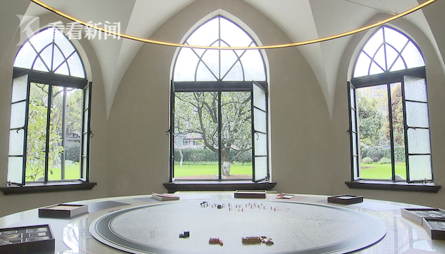 这间圆形转角书房,肌理漆处理的墙面、呈八角形的雪白屋顶、螺旋立柱,不加任何装饰,十分简约。孙科从不让外人随意进出,原来这里有一扇隐匿之门。如今,这扇固若金汤的保险箱铁门里,一平米的空间,配合展览被设置成了装置作品。